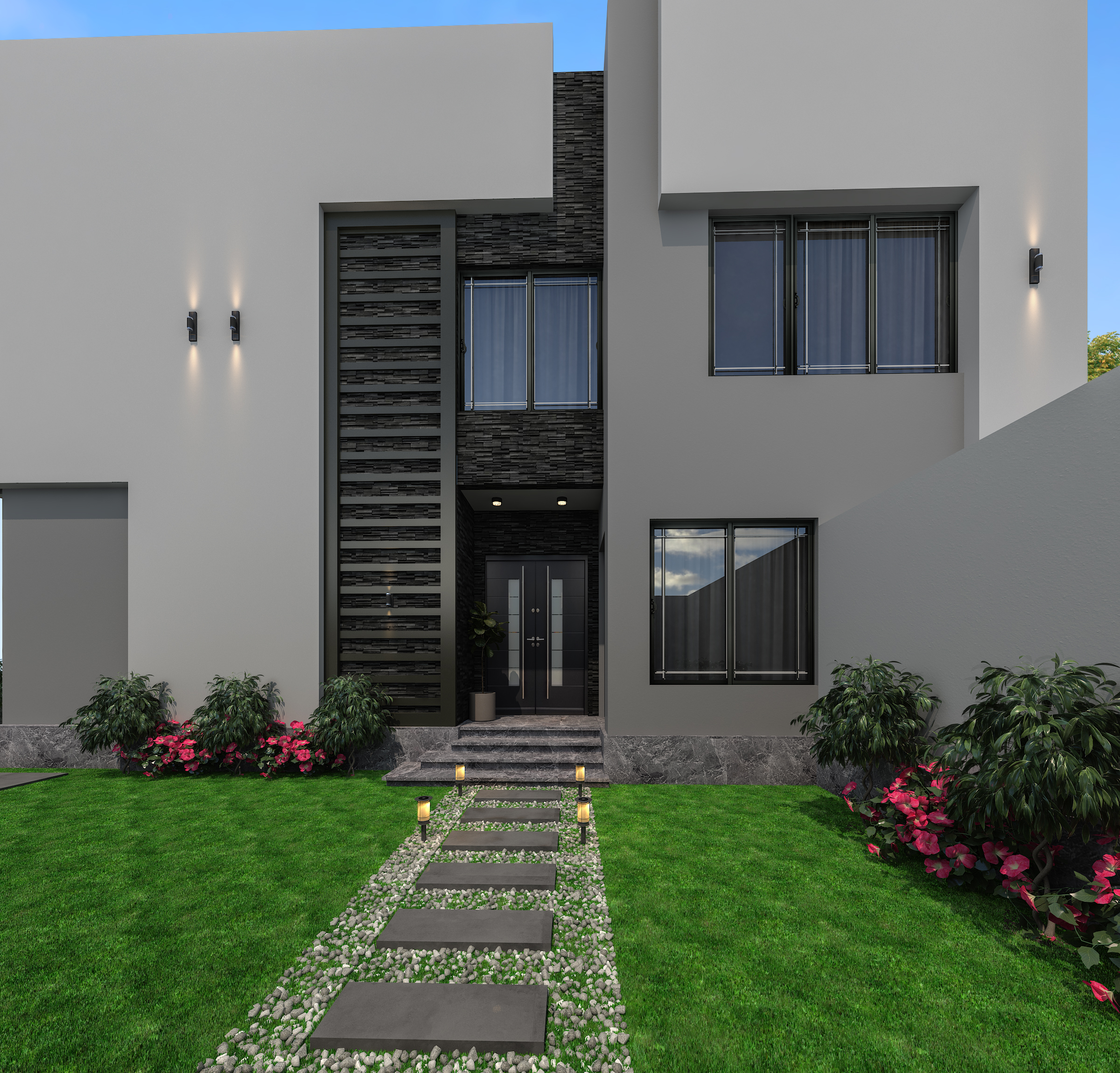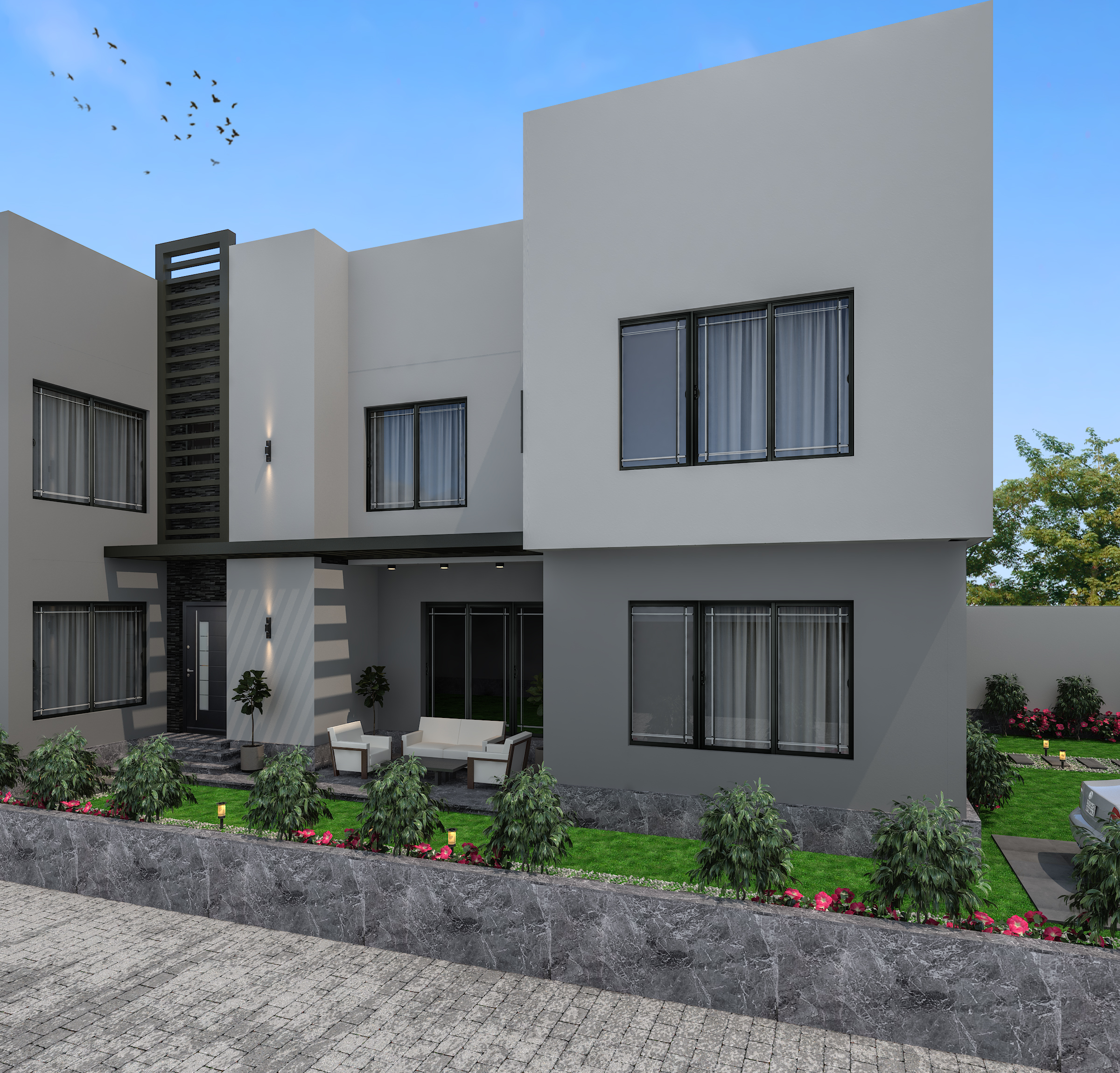 النمط الحديث ( Modern Architecture ):- • وهو النمط الذي يضم مجموعة من الأساليب المعمارية و التي تهدف في المقام الأول إلى تبسيط الأشكال إلى أشكال هندسية واضحة والتي تظهر جمال الحيز و المواد المستخدمة و الإستغناء عن الزخارف، كما إنها تخلق اتصال بصري بين المساحات الداخلية و الموقع الخارجي و الإعتماد الكبير على الإضاءة الطبيعية والألوان الطبيعية، وإستخدام مواد وأنظمة حديثة في البناء, كما يتميز النمط الحديث بالتوفير في التكلفة دون التأثير في جمالية وبساطة المبنى.
